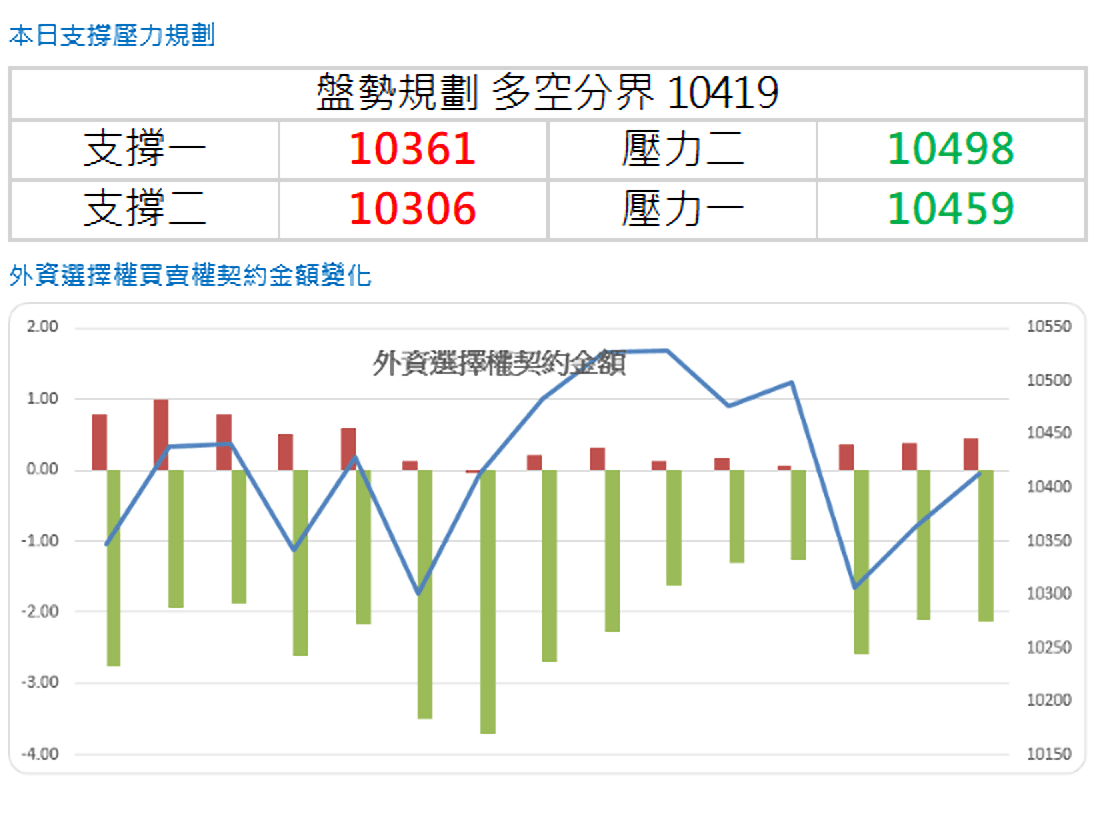 昨日的籌碼部分,盤中看到昨天主要還是台積電做為護盤重點,加上幾檔重點電子股,可以看到金融和傳產都是相對弱的走勢,外資盤後看到結束連續十二天的賣超轉為買超十二億元,這有利市場信心的回籠。這邊只有一個討厭的事情,官股行庫不要立即看到反彈過程中的賣股,反彈的格局才能走得更順利一些。期權的部分,兩大法人都是小幅偏多的布局,今天請留意有沒有震盪轉趨勢的可能,當然,前提是盤中現貨預估成交量需要看到擴增的情況。