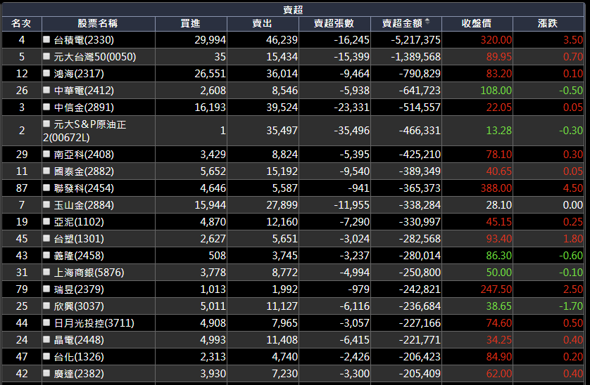 盤後籌碼部分,外資賣超171億元,賣超前三名台積電/台灣五十/鴻海。台積電上周五八大行庫護盤,又被外資提領了五十幾億,今天還要護盤嗎?盤中關注重點,這邊提供一個外資上周五賣超名單,對於上漲然後外資還再賣超的標的,我建議暫時避開。融資週五續減是好事,這時後融資增加也會讓操作難度提高。