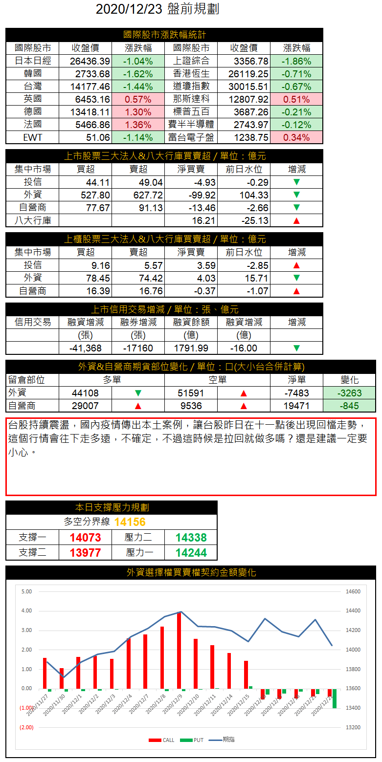 台股昨日先低後高,這邊走勢在計畫內,不過中午過後因為疫情傳出本土案例之後,行情急速的回檔修正,偉盤跌幅擴大,台股下跌1.44%,這樣的跌勢會到哪邊呢?由於本月開倉的逆價差一直很大,多少也給多方帶來一點緩衝的力道,今天開盤後也許還有下行的空間,可議注意回檔的過程中,找尋多方切入位置,做今天的結算行情,和本周五的耶誕操作。