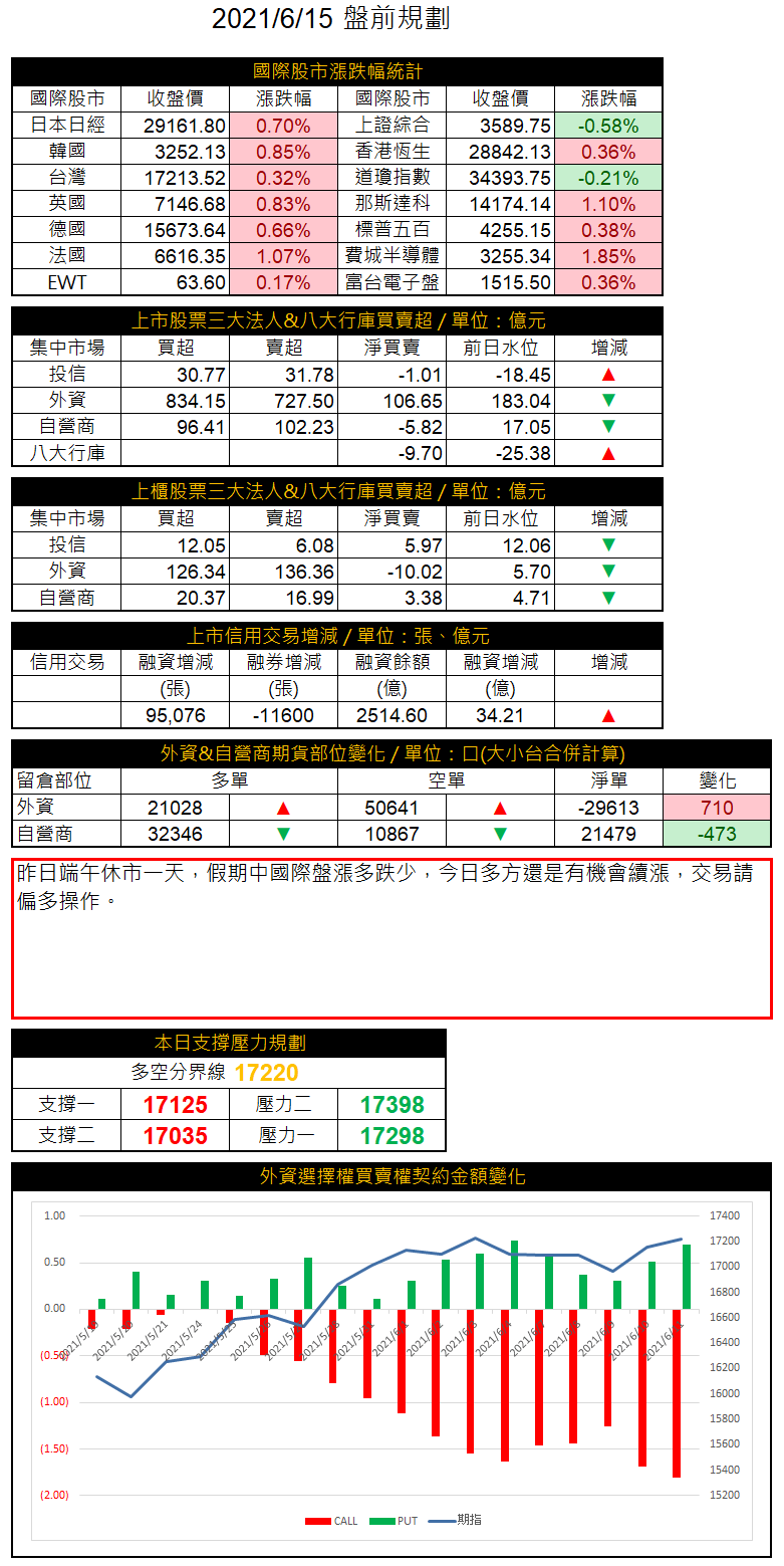 盤中如果看到成交量同步放大,多方有趨勢盤的可能,就不要太偏空;相反的盤中如果量能又持續縮減,那就小心嘎空後的回檔,畢竟明天就是六月合約結算日,外資目前的部位,拉高結算是自殺的行為。