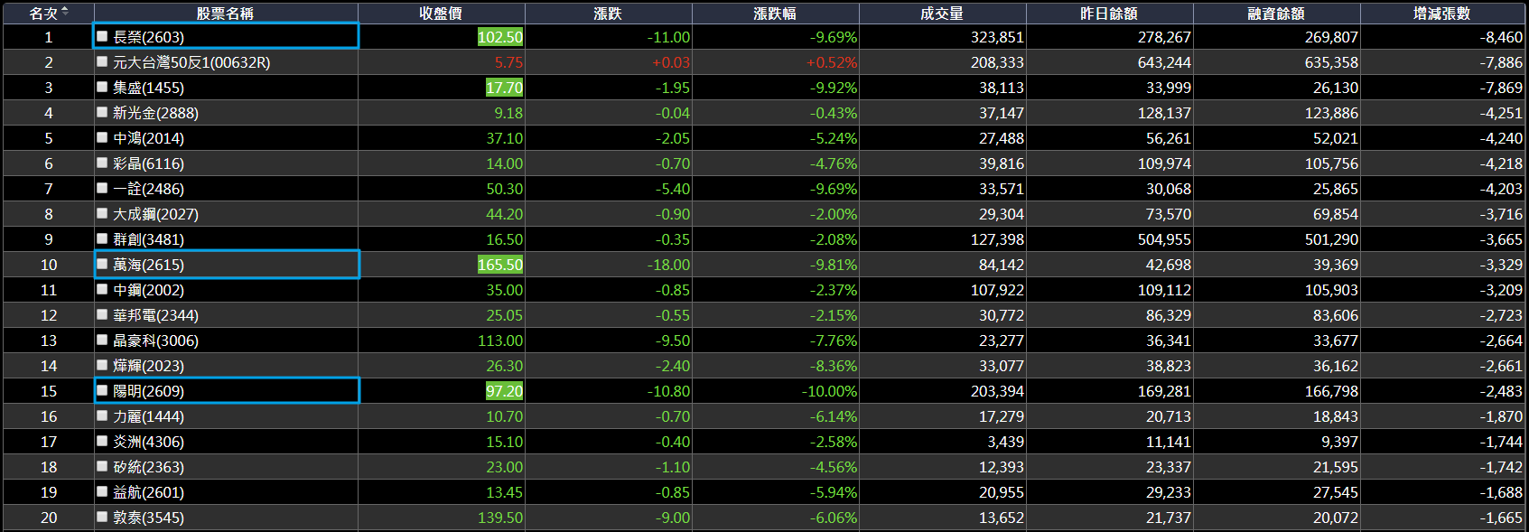 盤後看到的籌碼中,外資現貨賣超31.13億元,期貨仍就是多增空減,淨空單再減少2967億元,外資期貨多單部位已經連續三天增加,也許可以找一個有機會履約的選擇權合約做為明天的樂透標的。外資昨日買超貨櫃三雄,融資減少排名剛好這三檔也都在其中,是否真的散戶退場股價就能反彈呢?請留意。