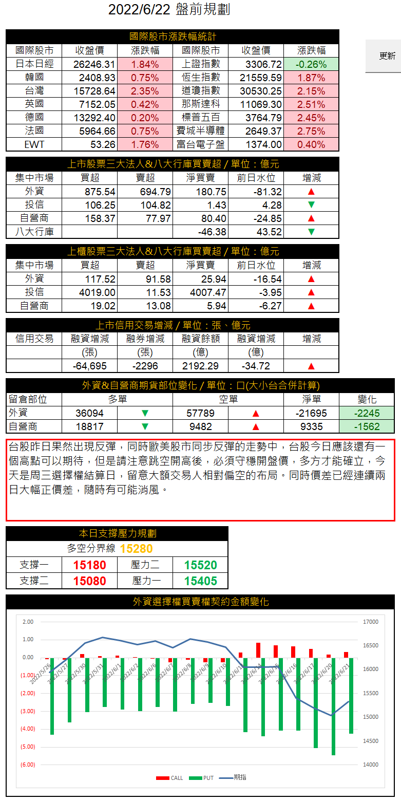 由於昨日歐美股市同步走漲,台股今日應該還有高點,請注意是開盤就發生,還是盤中出現,搭配今日的周選擇權結算,估計早盤出現高點機率高,請注意跳空SOP1,和0915/0945兩個關鍵時間出現A轉的狀況,如果有出現,可以短空單進場,或這用15800的履約價OP來取代。