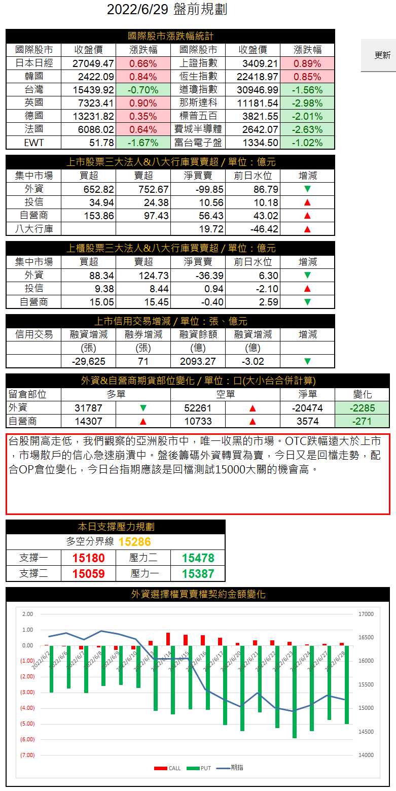 今日操作,周選擇權樂透建議觀察15300的履約價,盤中跌破支撐二請不要太追空(15000估計有支撐),反彈過15200,也許可以找看看放空的機會。