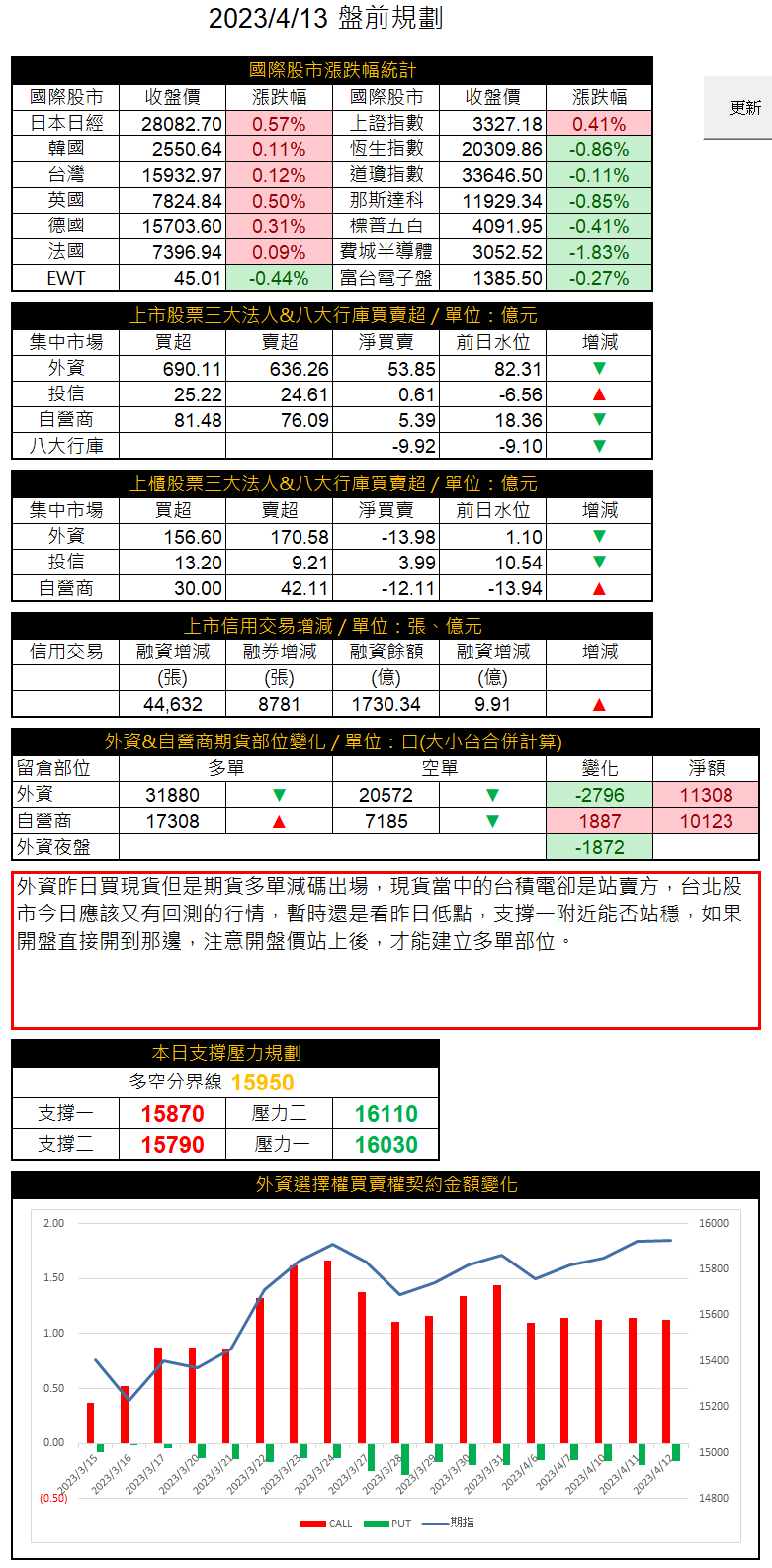 台北股市昨日跳測試支撐一後果然看到反彈,收盤小漲19.09點,外資買超現貨53億元,不過數據中觀察到外資賣超台積電,同時期貨多單獲利了結出場,今日有可能會再度回測支撐一,注意,如果回測失敗後,行情有再度回到15500的位置重新整理。