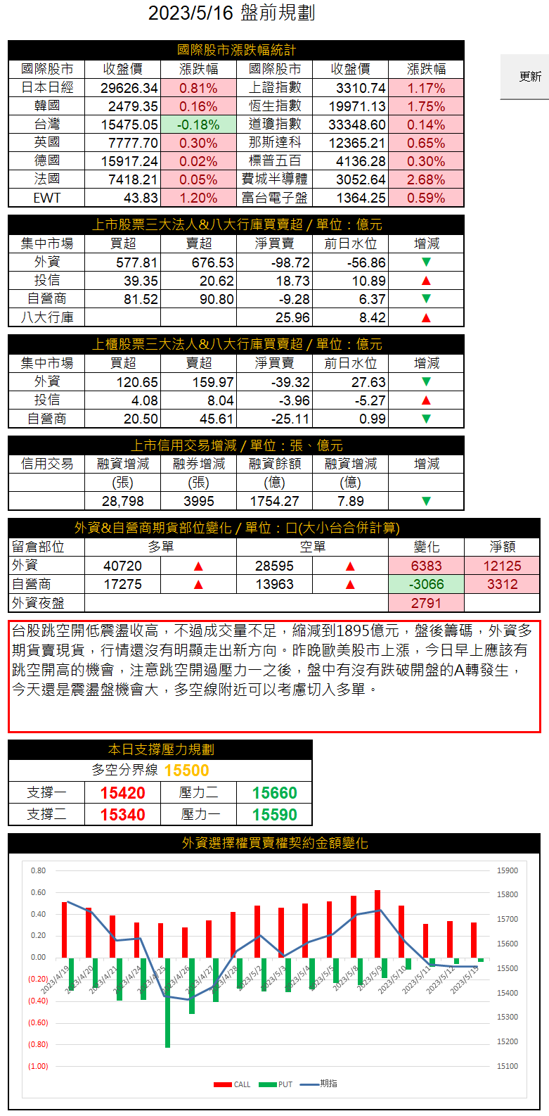 台指注意有沒有跳空開高後的SOP1(如果開盤直接上壓力一),盤中回檔到多空線附近,可以找多單切入機會,或操作選擇權參加明日的五月份期貨合約結算。