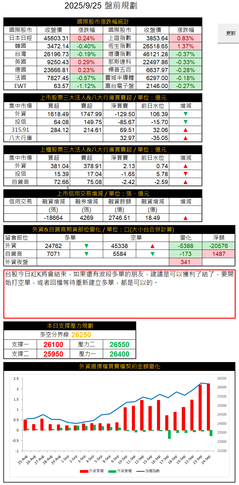 ▪利多消息:–外資夜盤期貨偏多操作 +341口。▪利空消息:–外資日盤期現貨同步偏空,現貨賣超 129.50億元,期貨 -3597口。–美股四大指數收跌。▪今日對策:–留意日K翻綠,多空線下請建立空單,行情會回測到哪邊先不預期。