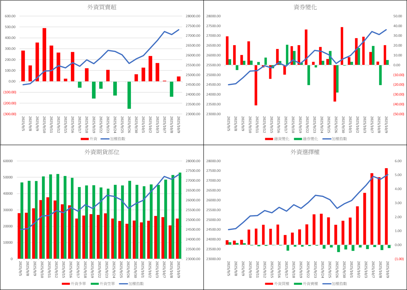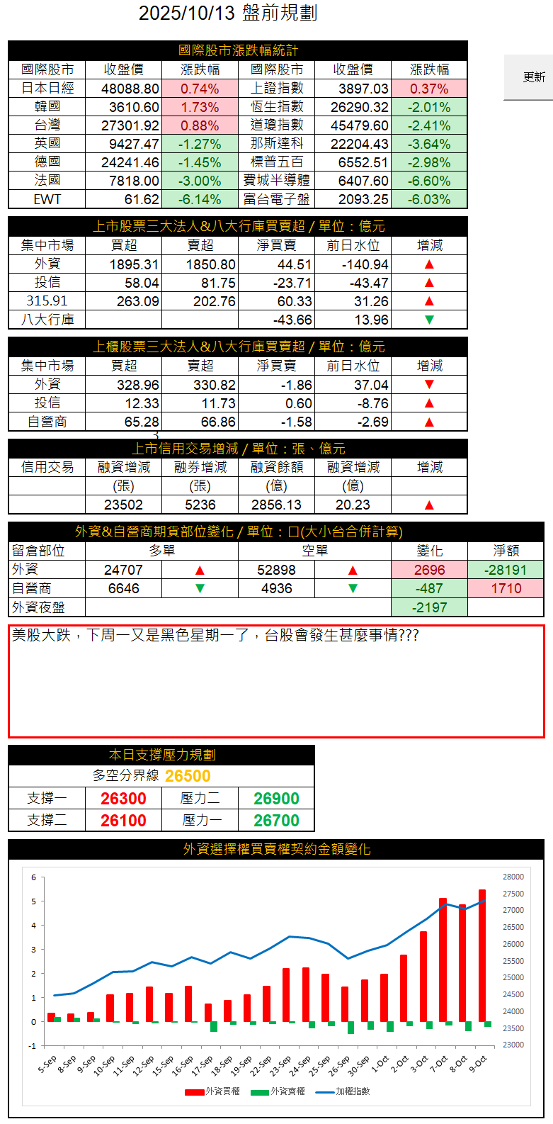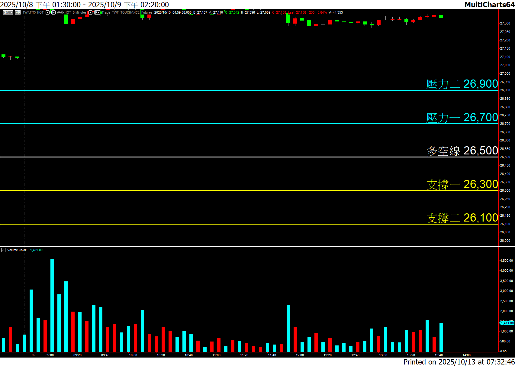 ▪利多消息:–外資10/09 日盤期現貨同步偏多,現貨買超 44.51億元,期貨 +926口。–美國期貨夜盤反彈。▪利空消息:–外資夜盤期貨偏空 -2197口。–國慶假期 國際股市崩盤 台積電ADR 合併下跌 -7.83%。▪今日對策:–注意開盤後的急殺,壓力二附近開盤,考慮空單直接進場。–日K翻綠K,注意留倉的方向 。–結算樂透 26500 履約價。