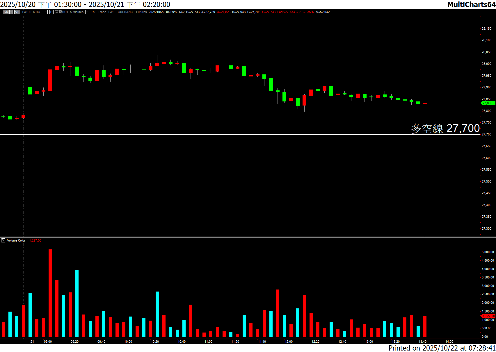 ▪利多消息:–外資日盤期貨偏多操作 +2547口。▪利空消息:–外資現貨賣超 -2.41億元。–外資期貨夜盤持續偏空 -3570口。–台積電ADR回檔 -1.07%,連續五根黑K。▪今日對策:–開盤價作為第二條多空分界線,站上開盤價可以偏多操作。盤中多空線27700不排除跌破,留意回測支撐一27550。–日K轉綠K,波段多單請出場。–結算樂透建議27500履約價。