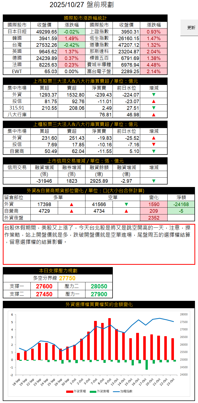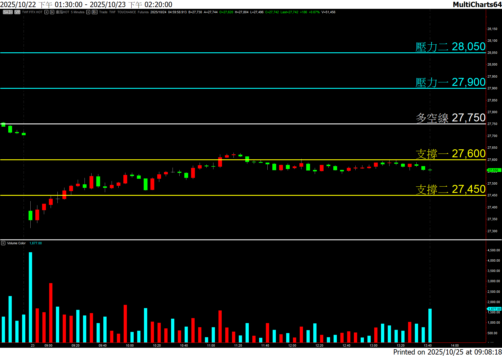 ▪利多消息:–外資日夜盤期貨偏多,日盤 +2315口,夜盤 +2352口。–美股指數反彈,台積電ADR合併反彈 +2.10%。▪利空消息:–外資日盤現貨持續賣超 -239.43億元。▪今日對策:–今天勢必出現跳空開高,開盤如果開在壓力二之上(28050)留意跌破開盤的跳空SOP1。–週五選擇權結算延後到今天,要操作結算樂透的朋友,可以參考28000履約價。