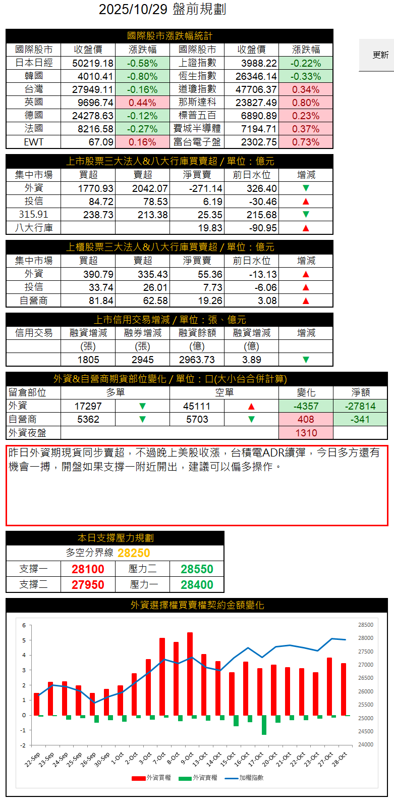 ▪利多消息:–外資夜盤期貨偏多操作 +1310口。–台積電ADR上漲 +1.10%。▪利空消息:–外資日盤期現貨同步偏空,現貨 -271.14億元,期貨 -2230口。▪今日對策:–開盤在28100附近開出,觀察跳空SOP2,多空線上方開出,留意SOP1。–結算樂透 28100 履約價。
