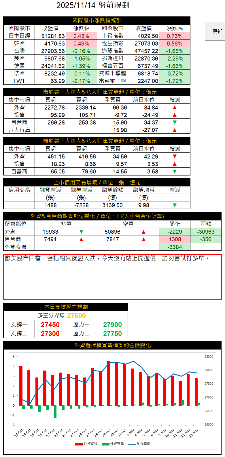 ▪利多消息:–無。▪利空消息:–外資日盤期現貨同步賣超,現貨 -66.36億元,期貨 -451口。–美國科技股回檔 台積電ADR 大跌 -2.90%。–外資夜盤期貨偏空操作 -3384口。▪今日對策:–沒有站上開盤價,不要亂打多單,反彈來到27900附近開始找空單切入機會。