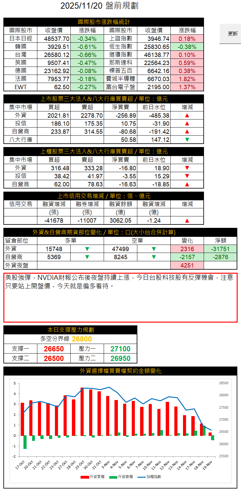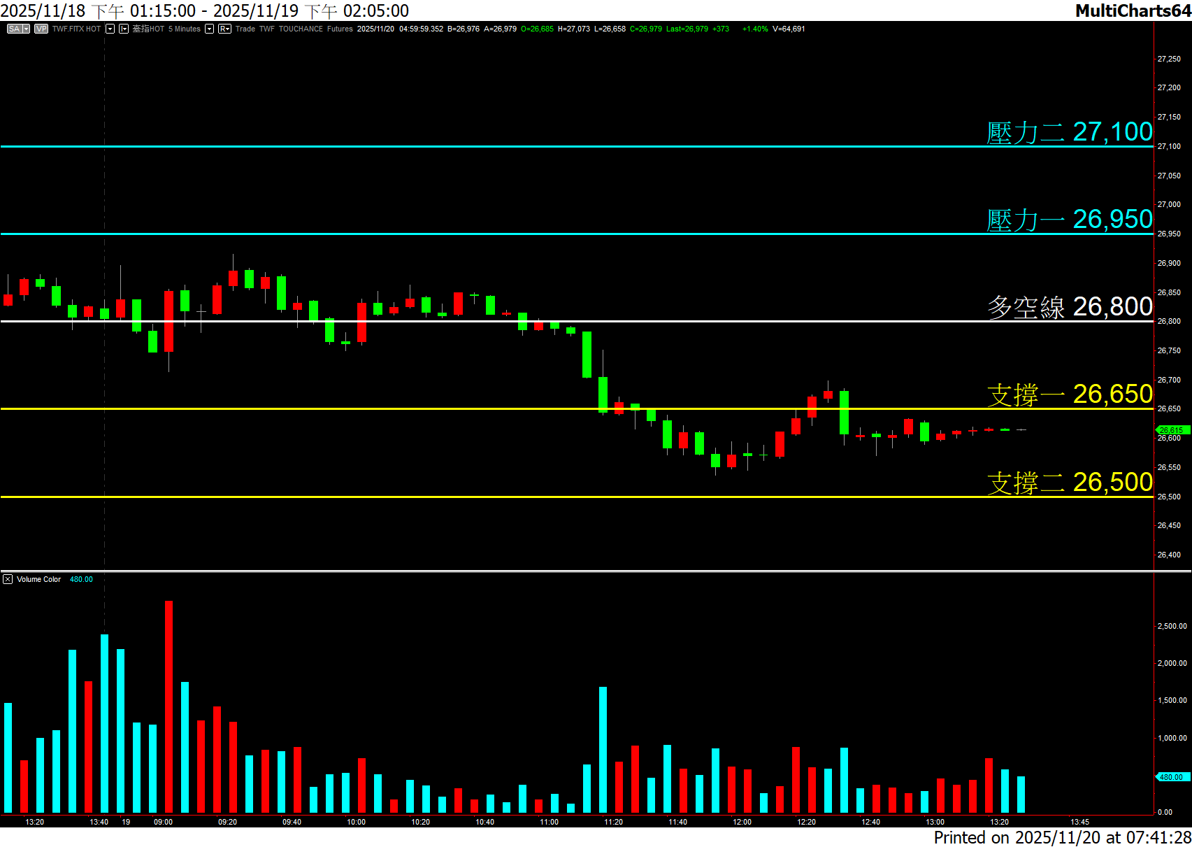 ▪利多消息:–外資夜盤期貨偏多 +4251口。–台積電ADR反彈上漲 +1.60%。▪利空消息:–外資日盤現貨持續賣超 -256.89億元。▪今日對策:–開盤價作為第二條多空分界線,線上偏多,上方不預設高點。現貨開盤後如果有回檔發生,多空線附近(26800)找多方切入機會。–新倉開倉日,注意行情上下震盪機率高,避免追高殺低的操作。
