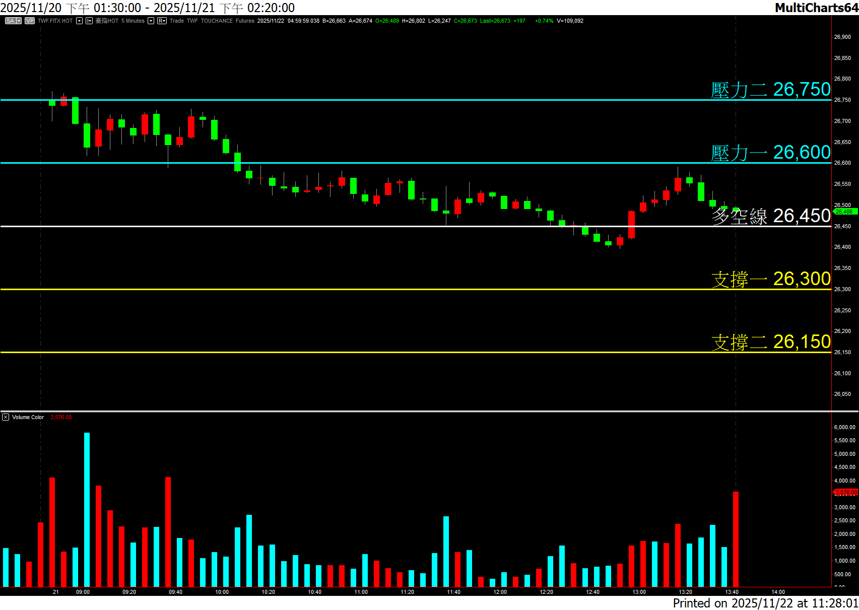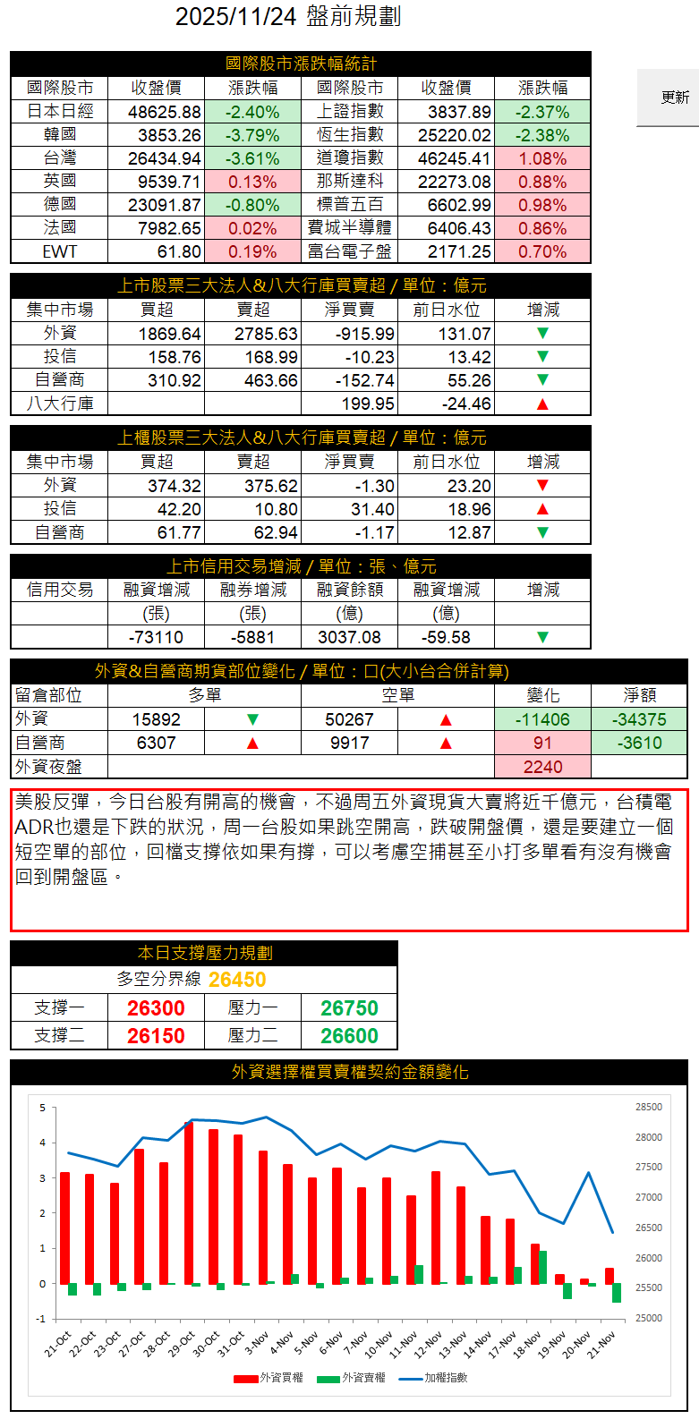 利多消息:外資夜盤期貨偏多操作 +2240口。利空消息:外資日盤期現貨同步大偏空,現貨賣超 -915.99億元,期貨 -4972口。台積電ADR續跌 -0.88%。今日對策:跳空開高壓力二之上,跌破開盤價,請務必打入空單。特別現貨開盤前。回檔如果支撐一有反彈,空單可以減碼,甚至打一個短多單,看看能否回去開盤區。