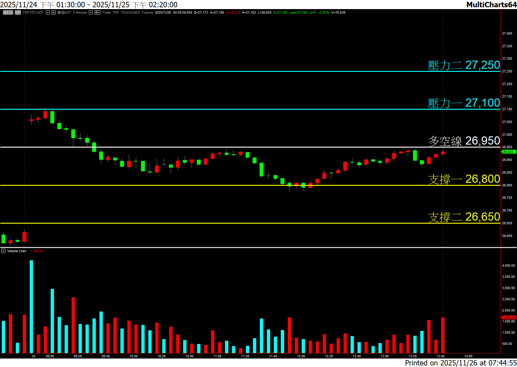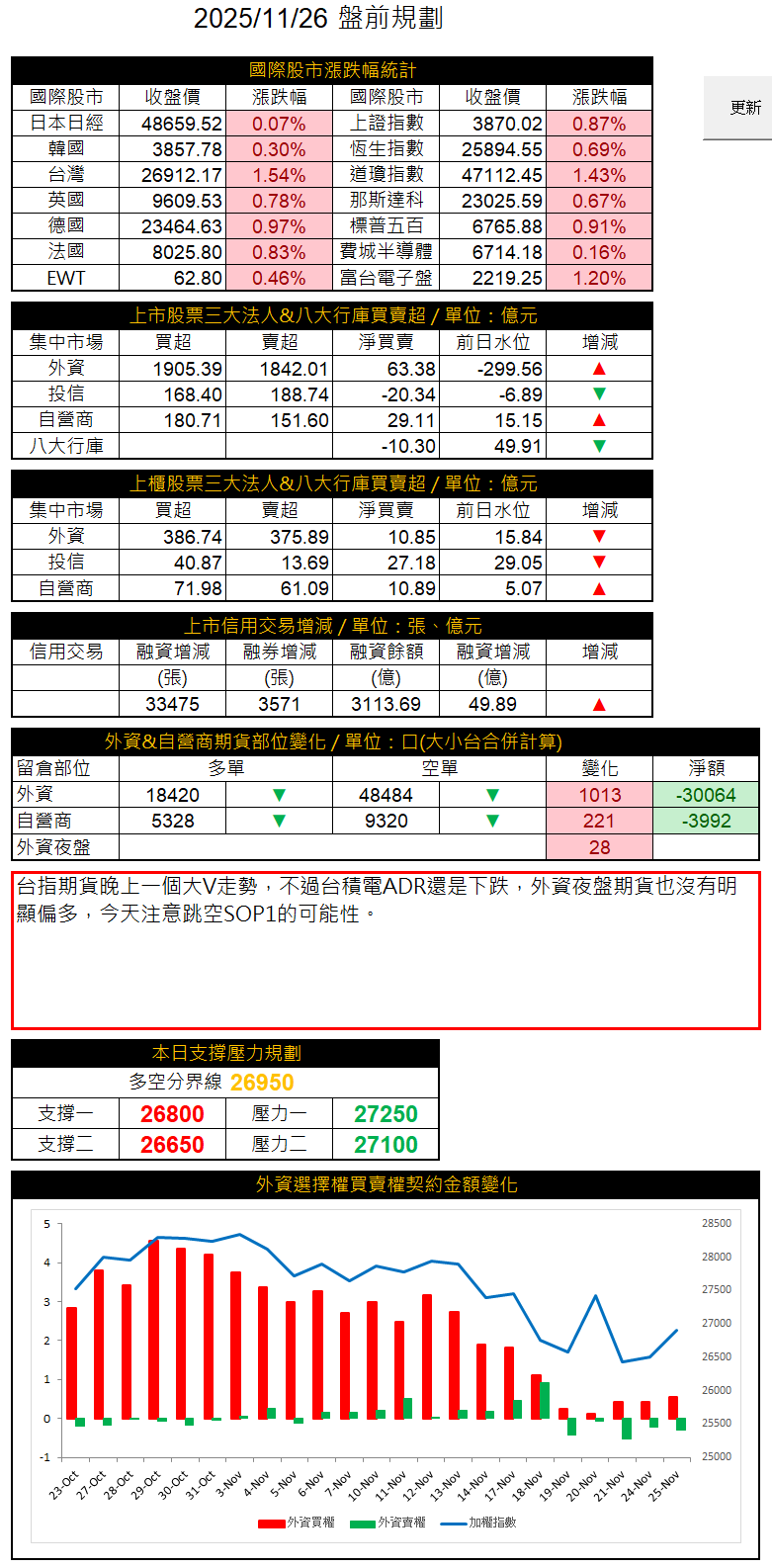 ▪利多消息:–外資線貨轉賣為買,買超 63.38億元。–外資夜盤期貨小偏多操作 +28口。–台積電ADR 微微漲 +0.01%。▪利空消息:–外資日盤期貨偏空操作 -1227口。▪今日對策:–跳空開高壓力一之上,注意跳空SOP1機會。日K續紅機率高,還是一樣回檔找多點,可以觀察支撐一附近。–周選擇權結算日,結算樂透27000履約價。