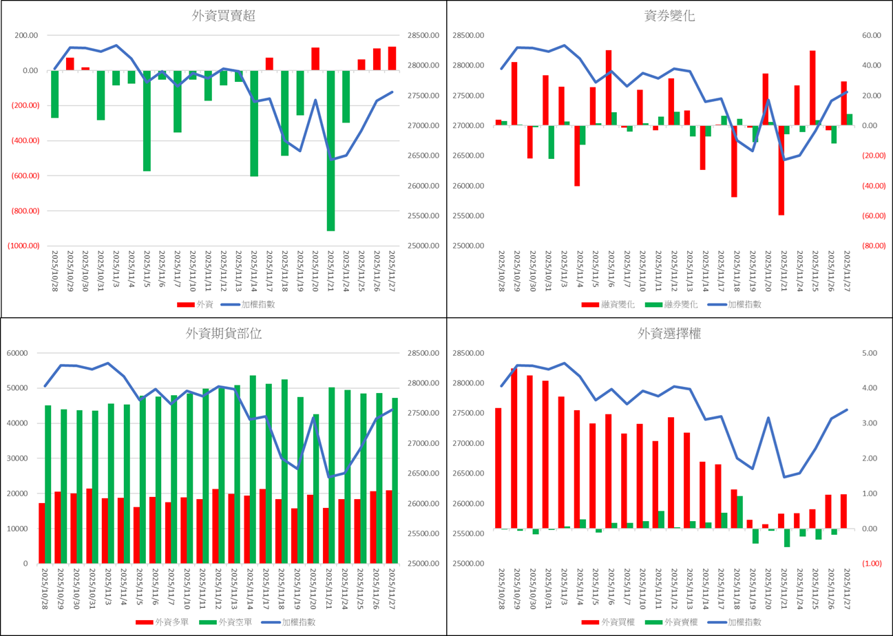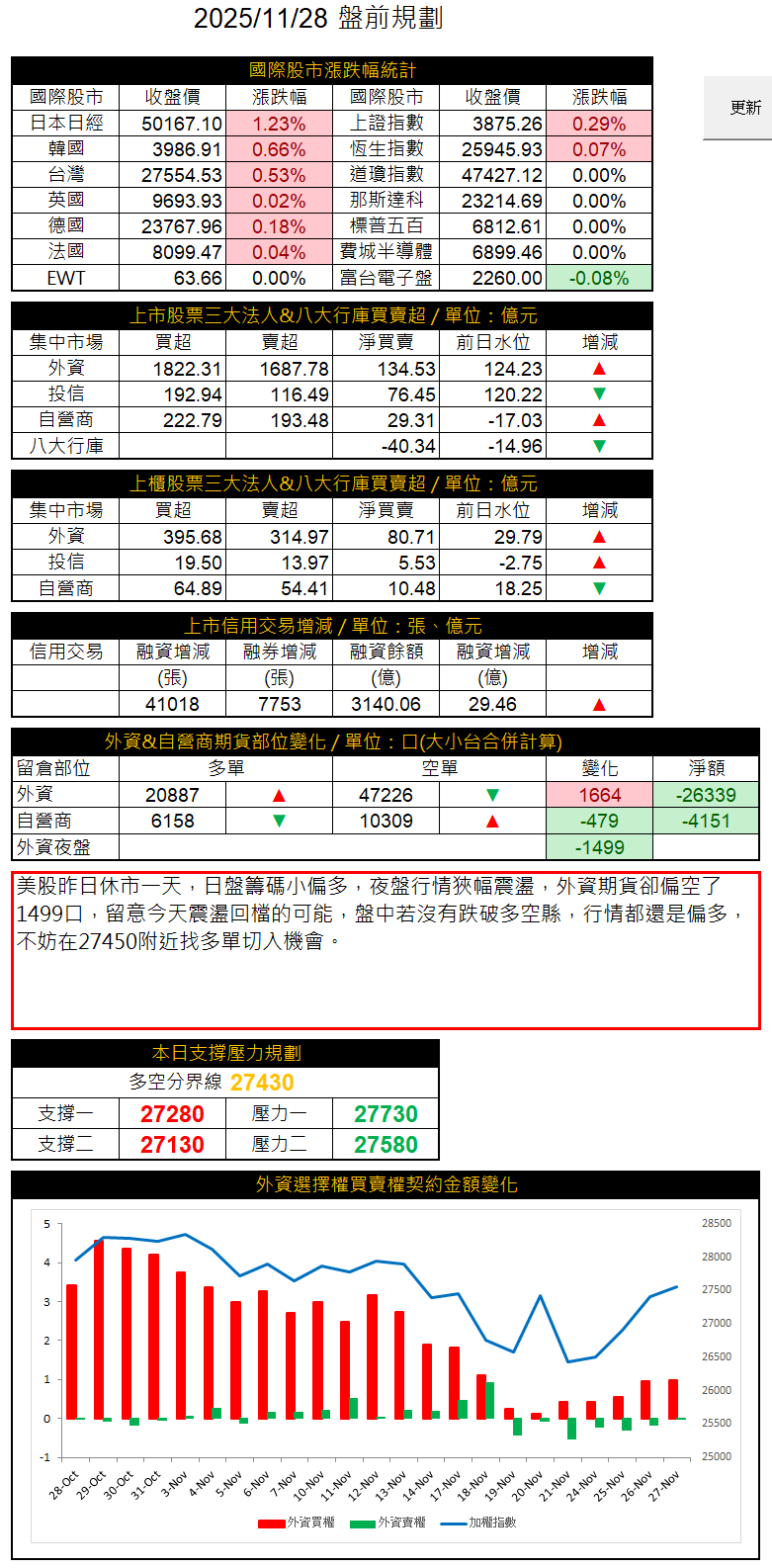 ▪利多消息:–外資日盤期現貨同步偏多,現貨買超 134.23億元,期貨 +2234口。▪利空消息:–外資夜盤期貨偏空操作 -1499口。▪今日對策:–跳空開高壓力二之上,注意SOP1走勢。盤中回檔27450附近觀察有沒有反轉。–如果回測多空線,日線紅K將會被破壞,多單離場。–周五尾盤注意減少留倉部位。
