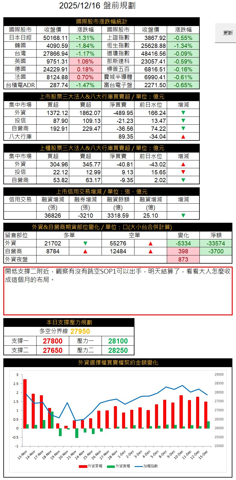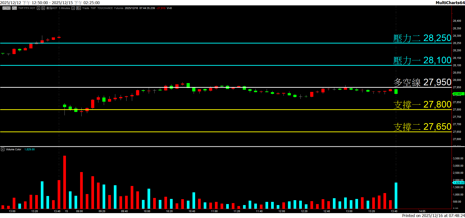 –沒有站上開盤價,不能打多單。明日12月期貨合約結算,是有機會看到反彈,但是必須看到行情真的反彈才能出手。如果收盤前無法有效站上壓力一,短多單不能留倉。