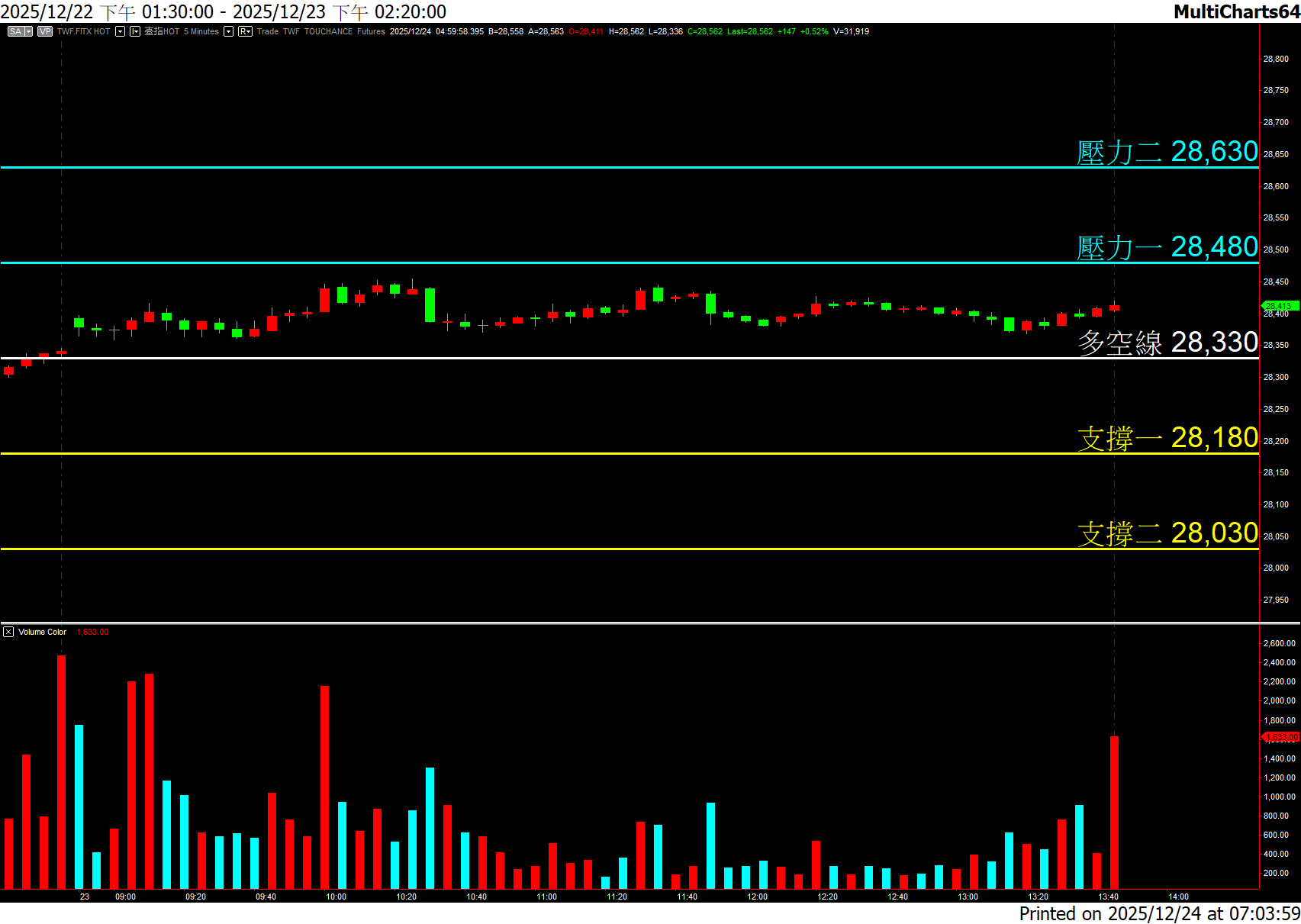 –震盪整理格局,注意開盤價作為第二條多空分界線,上半場多方機率高,注意壓力二附近的多單出場機會。跌破開盤價偏空,觀察多空線附近的V轉是否發生。