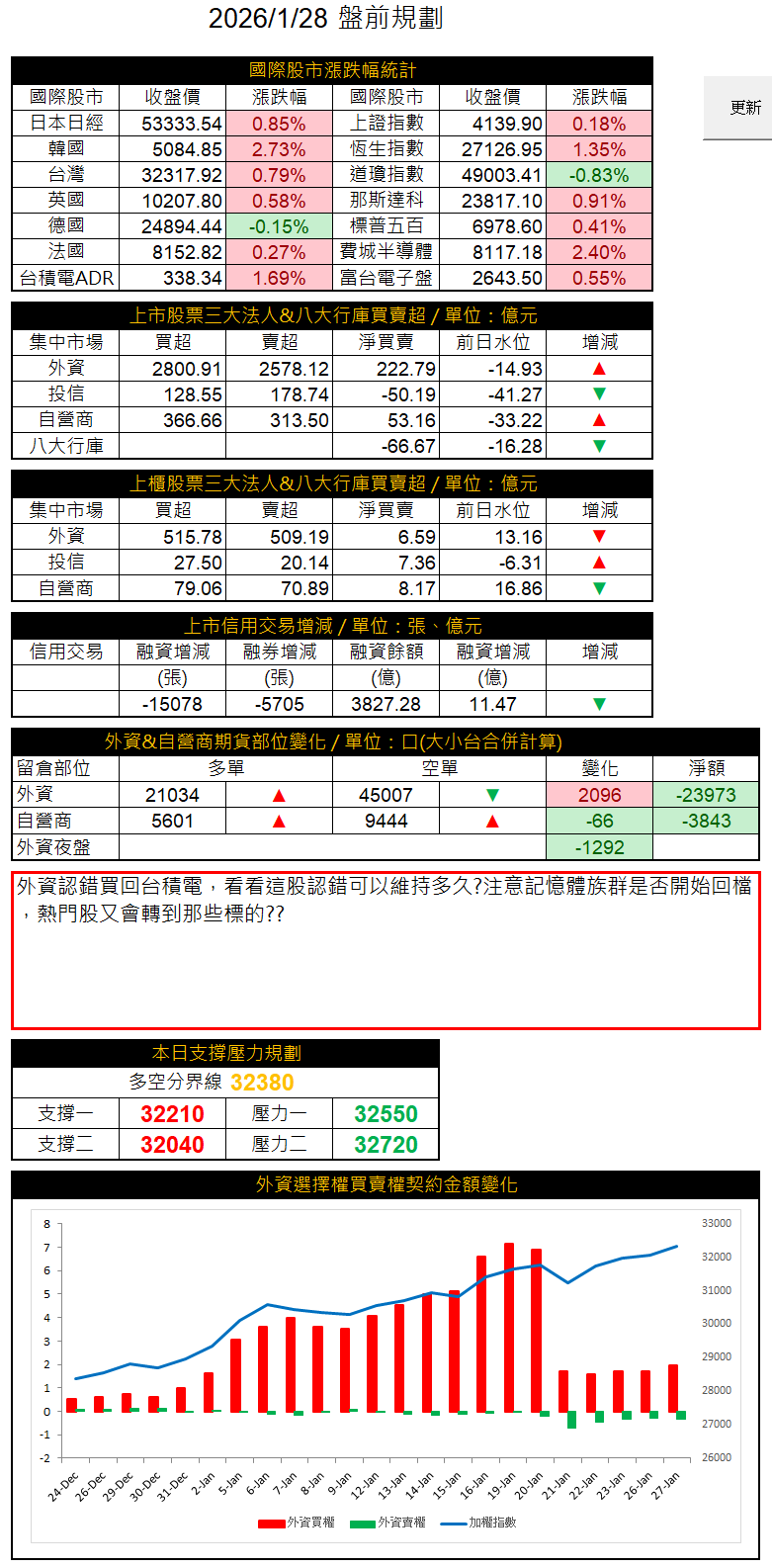 ▪利多消息:–外資現貨轉賣為買,買超 222.79億元。台積電買超。–台積電ADR上漲 +1.69%。▪利空消息:–外資期貨日夜盤同步偏空操作,日盤 -658口,夜盤 -1292口。▪今日對策:–日K有機會續紅,多方延續,走勢。回檔觀察多空線附近,可以建立多單部位。壓力二上追多請小心。–OP樂透32500履約價。