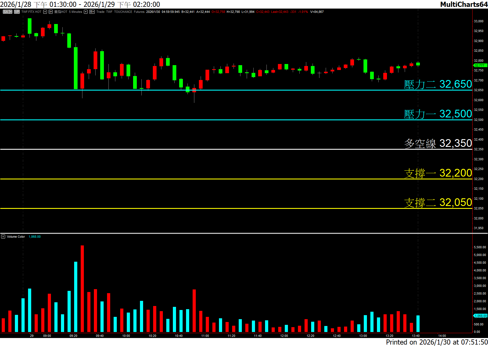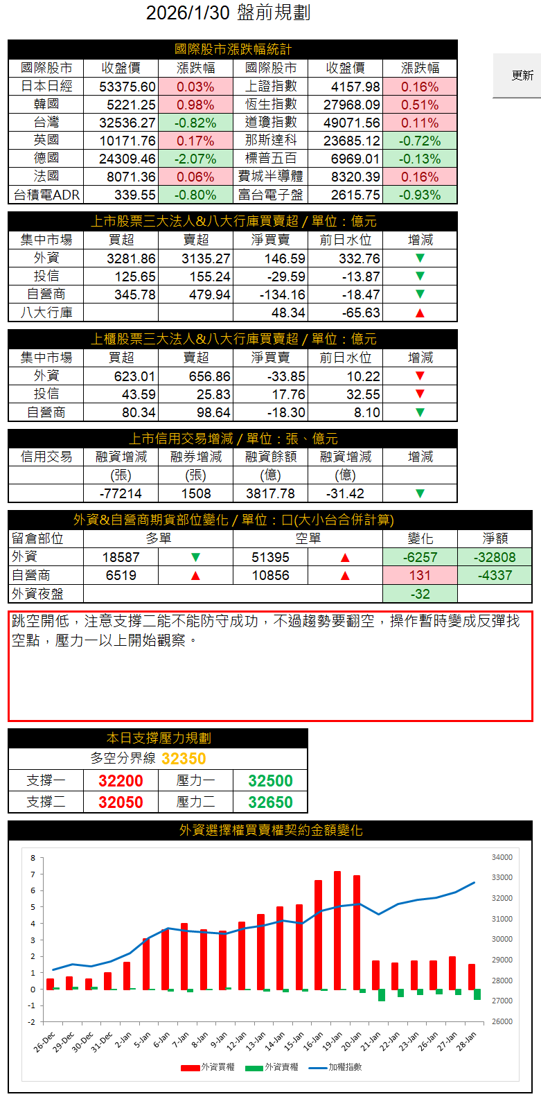▪利多消息:–外資現貨連三買,買超 146.59億元。▪利空消息:–外資期貨日夜盤同步偏空操作,日盤 -1095口,夜盤 -32口。–台積電ADR回檔下跌 0.80%。▪今日對策:–跳空開低出現後,沒有站上開盤價,不要亂打多單。回檔留意支撐一以下找反轉的機會先補空單(可以短多但是請注意)。–日K翻綠,操作改成空方思考模式,壓力二上找空點。