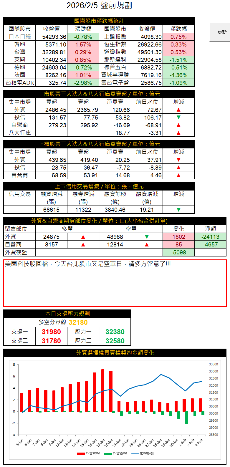 ▪利多消息:–外資日盤期現貨同步偏多,現貨 買超 120.66億元,期貨 +2144口。▪利空消息:–外資期貨夜盤大 -5098口。–美國指數回檔,台積電ADR下跌 -2.98%,收盤跌破月線支撐。▪今日對策:–跳空開低,支撐二以下追空請留意,如果直接開低支撐二以下注意SOP1。–日K翻綠,反彈壓力一附近開始找尋空單進場機會。–A指標。