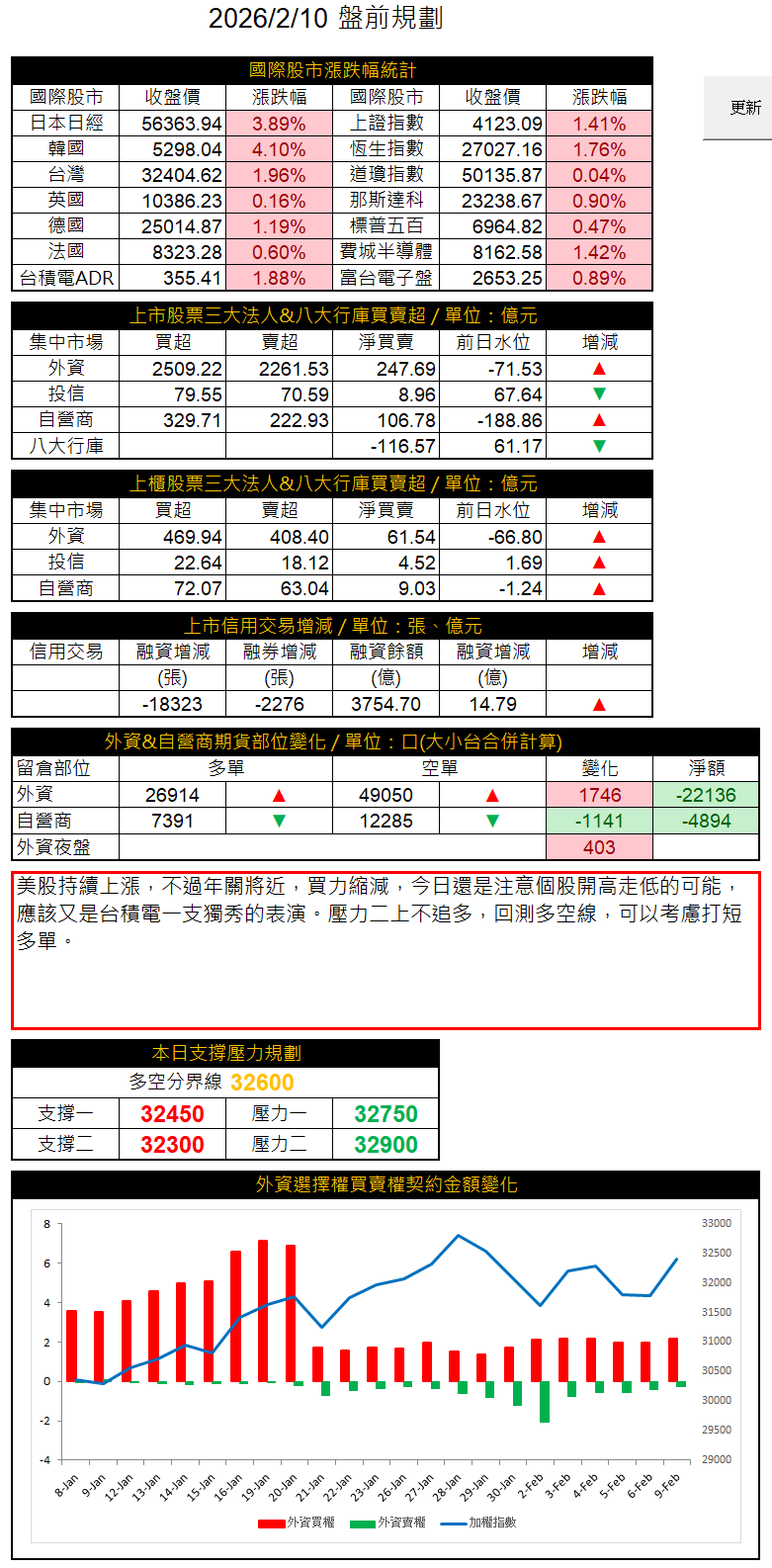 ▪利多消息:–外資現貨轉賣為買,買超 247.69億元。–外資期貨夜盤小偏多 +403口。–美股續漲,台積電ADR上漲 +1.88%,收盤創新高。▪利空消息:–外資日盤期貨偏空操作 -3208口。▪今日對策:–跳空開高機會大,一樣注意壓力二上開盤不追多,觀察SOP1的機會。–日K持續紅K機率高,回測多空線/支撐一,多單右邊進場。