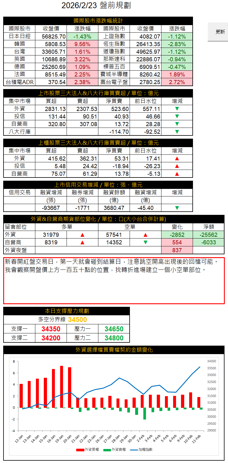 ▪利多消息:–外資現貨大買 523.60億元。–台積電ADR續漲 +2.38%。–年假期間富台期貨指數合計上漲2.72%。▪利空消息:–年前最後一個交易日選擇權大額交易人 SC+BP。▪今日對策:–震盪機率高,注意跳空開高後,如果不敢追高的朋友,耐心等待開盤價+200點觀察有沒有轉折的機會出現。可以做BP參加結算行情。–選擇權結算樂透34200履約價。