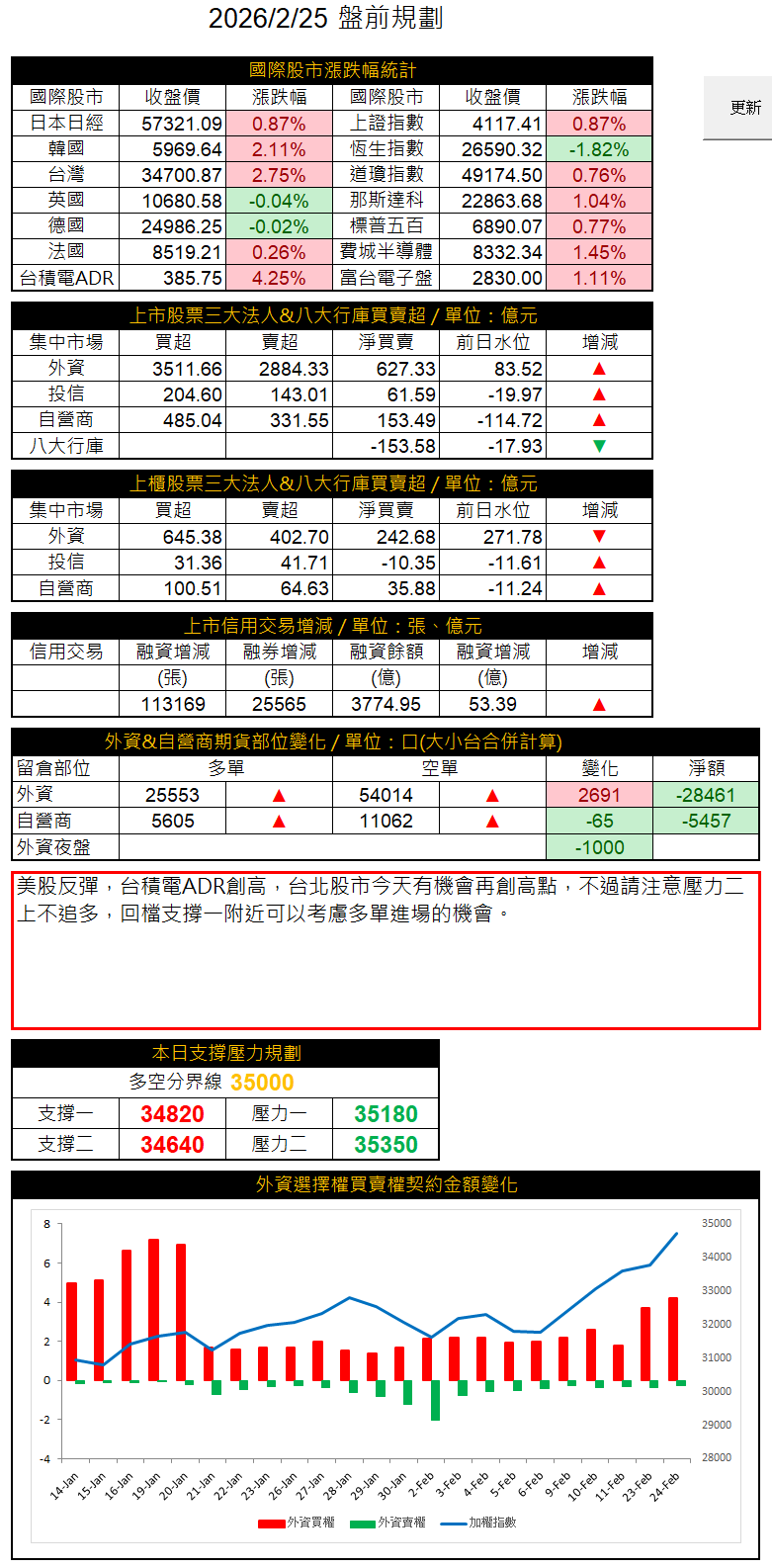 ▪利多消息:–外資現貨買超 627.33億元,期貨偏多操作 +826口。–美股四大指數收漲,台積電ADR收盤創高 +4.25%。▪利空消息:–外資期貨夜盤偏空操作 -1000口。▪今日對策:–壓力二上不追多,開盤直接開壓力二以上觀察跳空SOP1的機會。日K續紅機會高,回檔找多單上車的機會。注意回測支撐一的右邊進場做多機會。–尾盤周選擇權結算,富台結算留意震盪機率高。結算樂透35100履約價。