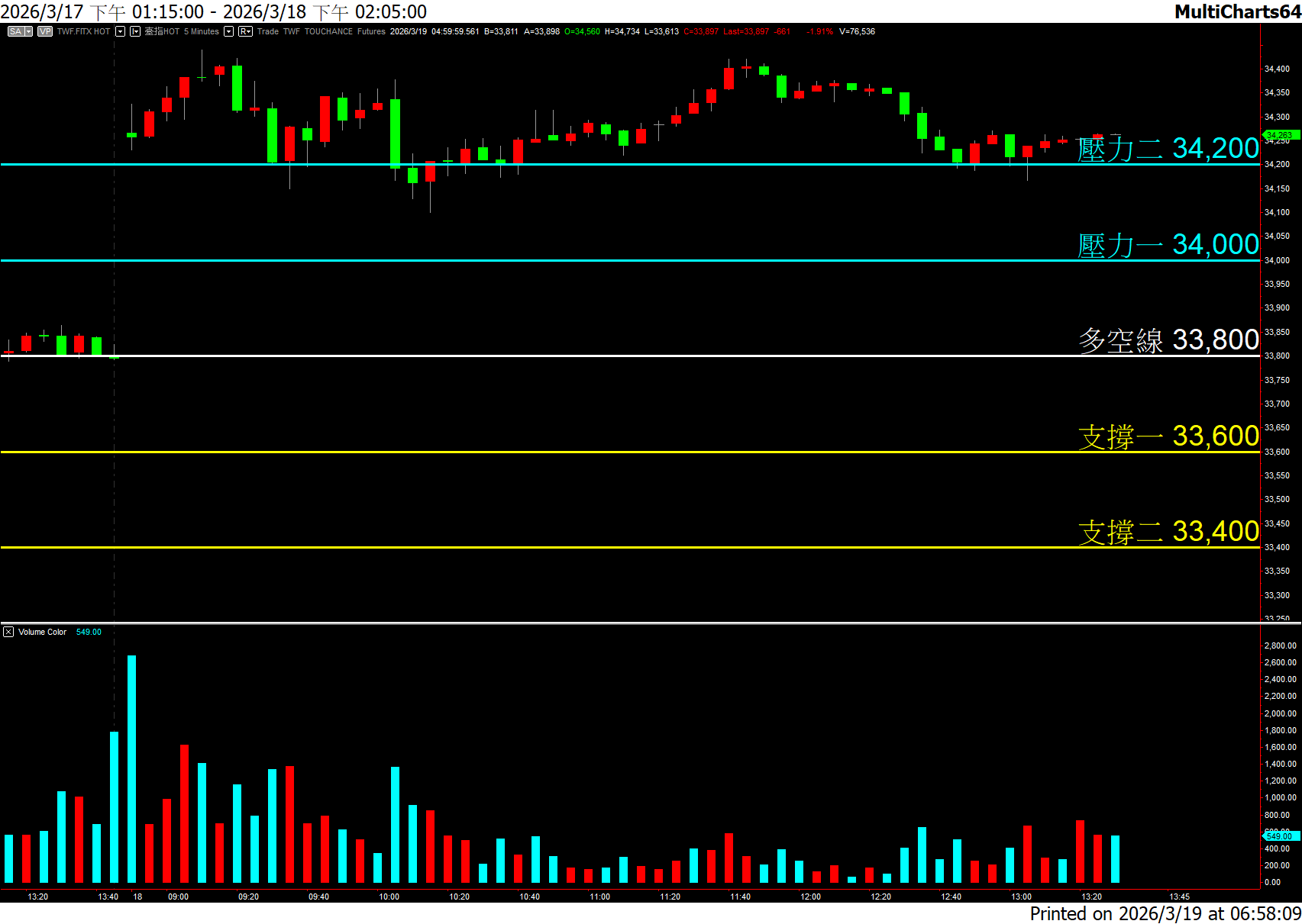 ▪利多消息:–外資現貨持續買超 +90.21億元。▪利空消息:–歐美股市下跌。台積電ADR下跌 -1.85%。–外資夜盤期貨大偏空 -6637口。▪今日對策:–跳空開低機率高,沒有站上開盤價請不要隨意打多單,支撐二下追空請小心。–紅K很有機會消失,綠Kor灰K待觀察,建議逢高布局空單,壓力一附近可以開始觀察。