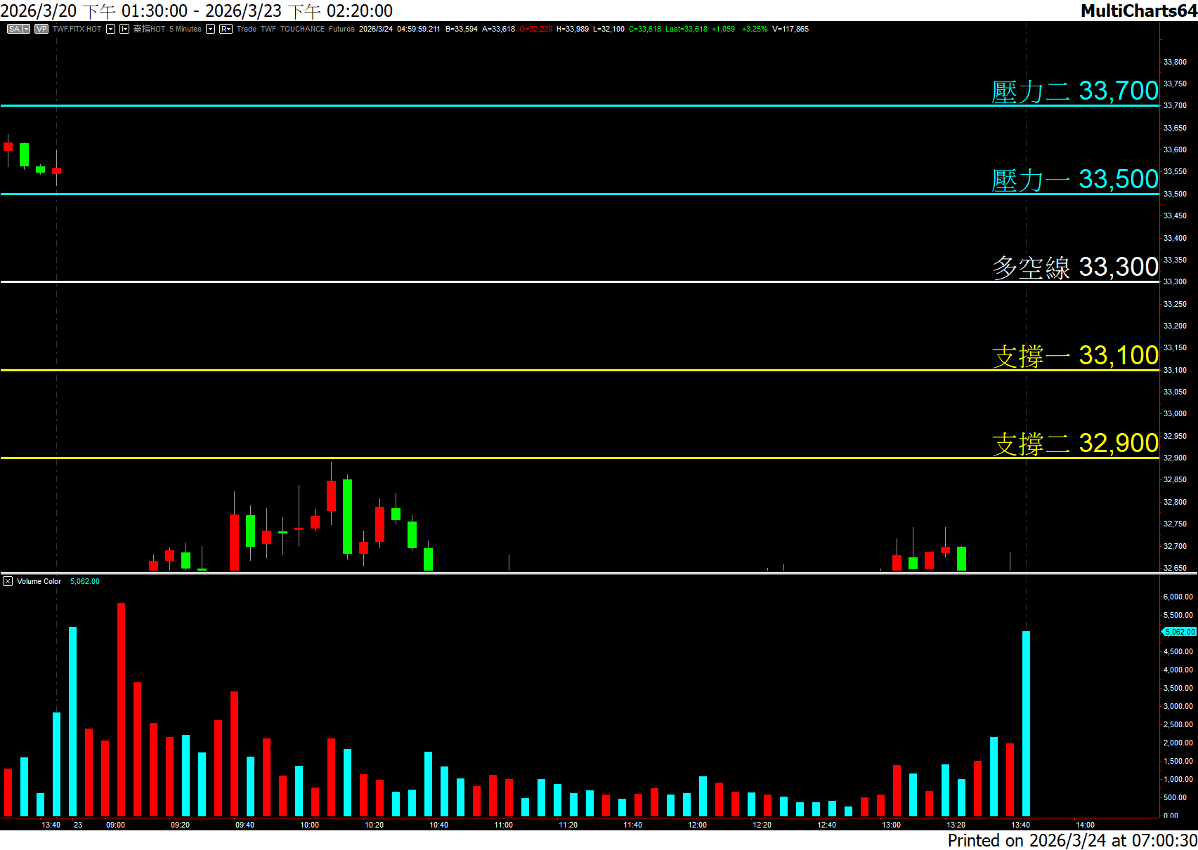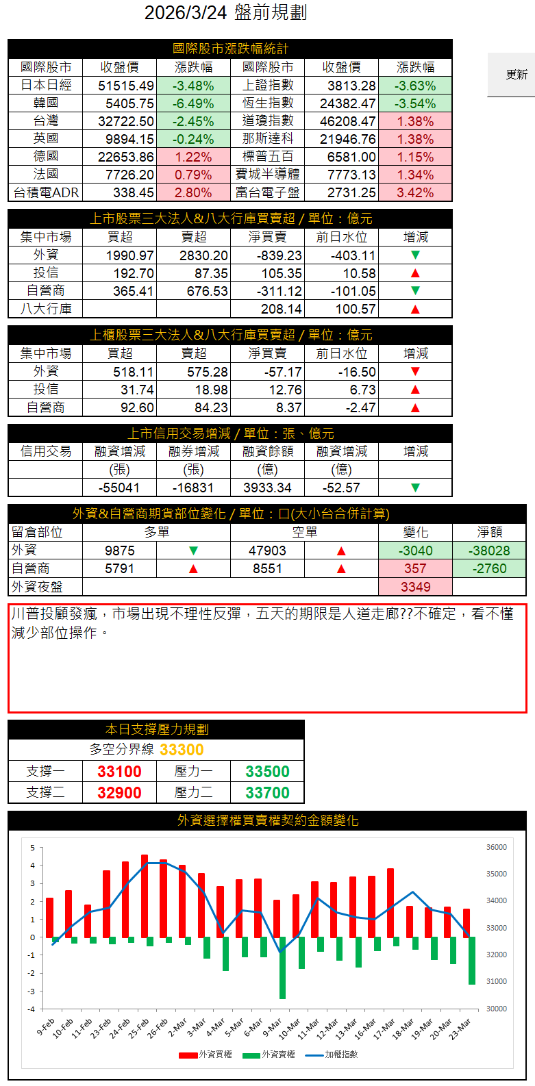 ▪利多消息:–外資期貨夜盤偏多操作 +3349口。–歐股市反彈。台積電ADR大漲 +2.80%。▪利空消息:–外資日盤期現貨同步偏空,現貨賣超 839.23億元,期貨 -90口。▪今日對策:–又是跳空日,老規矩,開盤價做為第二條多空分界線,參考開盤後的表現,壓力二上追多請小心。–回檔測試支撐一後,開始找尋V轉的多單切入機會。